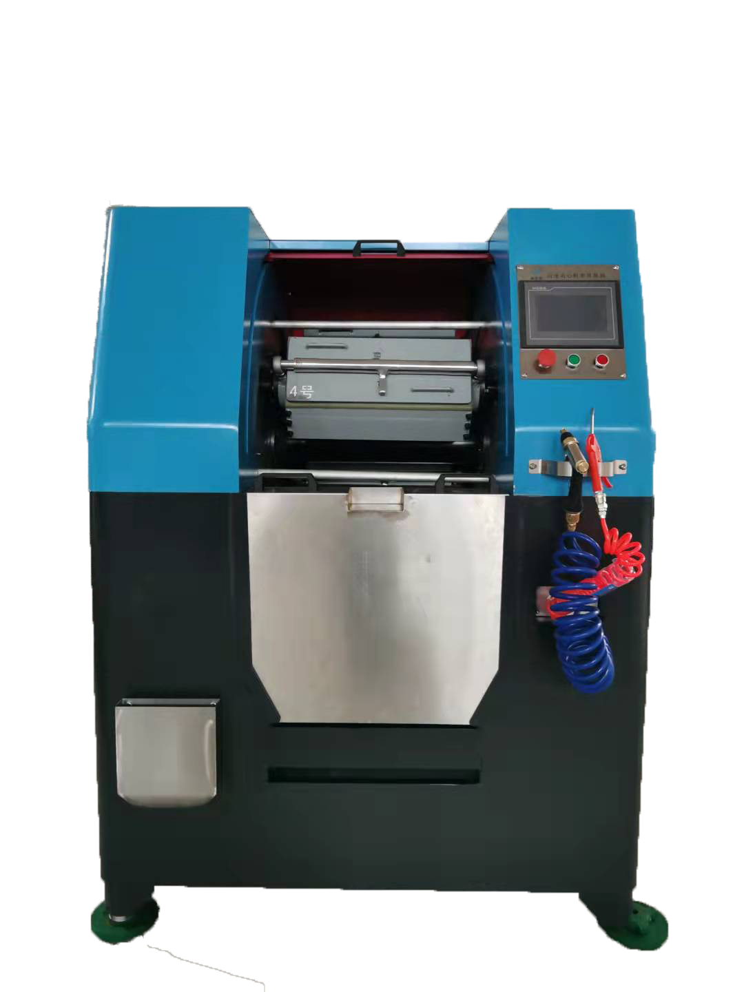 離心研磨機(jī)內(nèi)裝有四個小滾筒,在研磨加工時,四個小筒所裝物料的重量應(yīng)相當(dāng);有時零件的加工量較少時,可以僅使用其中的兩個時,需特別注意的是:兩個滾筒應(yīng)對稱地放置在滾動體中,而且兩個滾筒的所裝磨物的重量也應(yīng)相當(dāng),防止因離心不平衡,使機(jī)器劇烈擺動,造成故障。